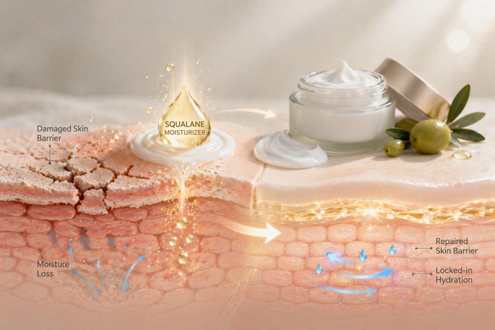 Olive squalane behaves differently. On skin, it absorbs in roughly 60 to 90 seconds. After that, there’s no film, no shine, no sensation of anything sitting on top. The skin just feels soft and comfortable hydrated without being coated. That’s what separates it from heavier options and makes it such a valuable base ingredient in any skin repair moisturizer formula.