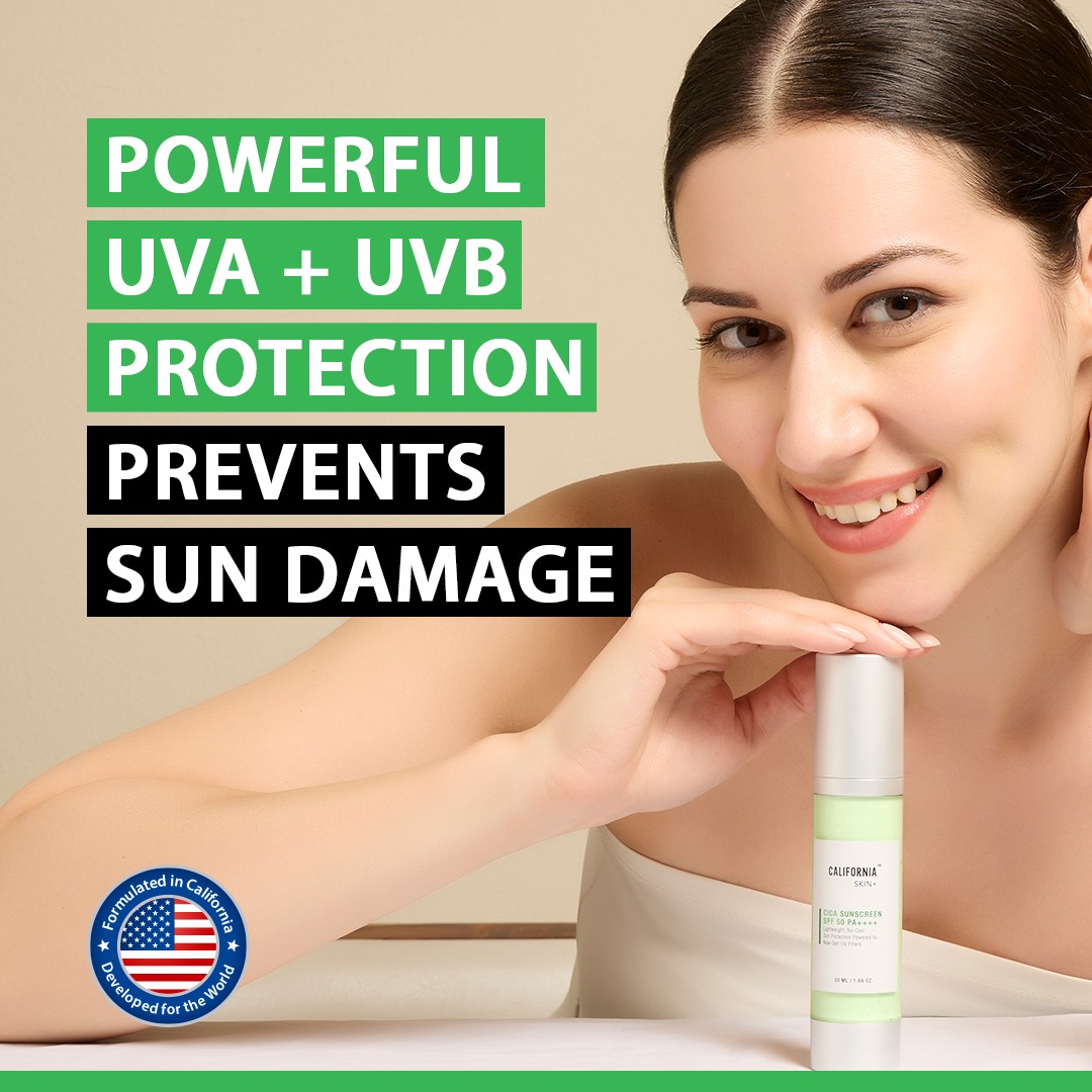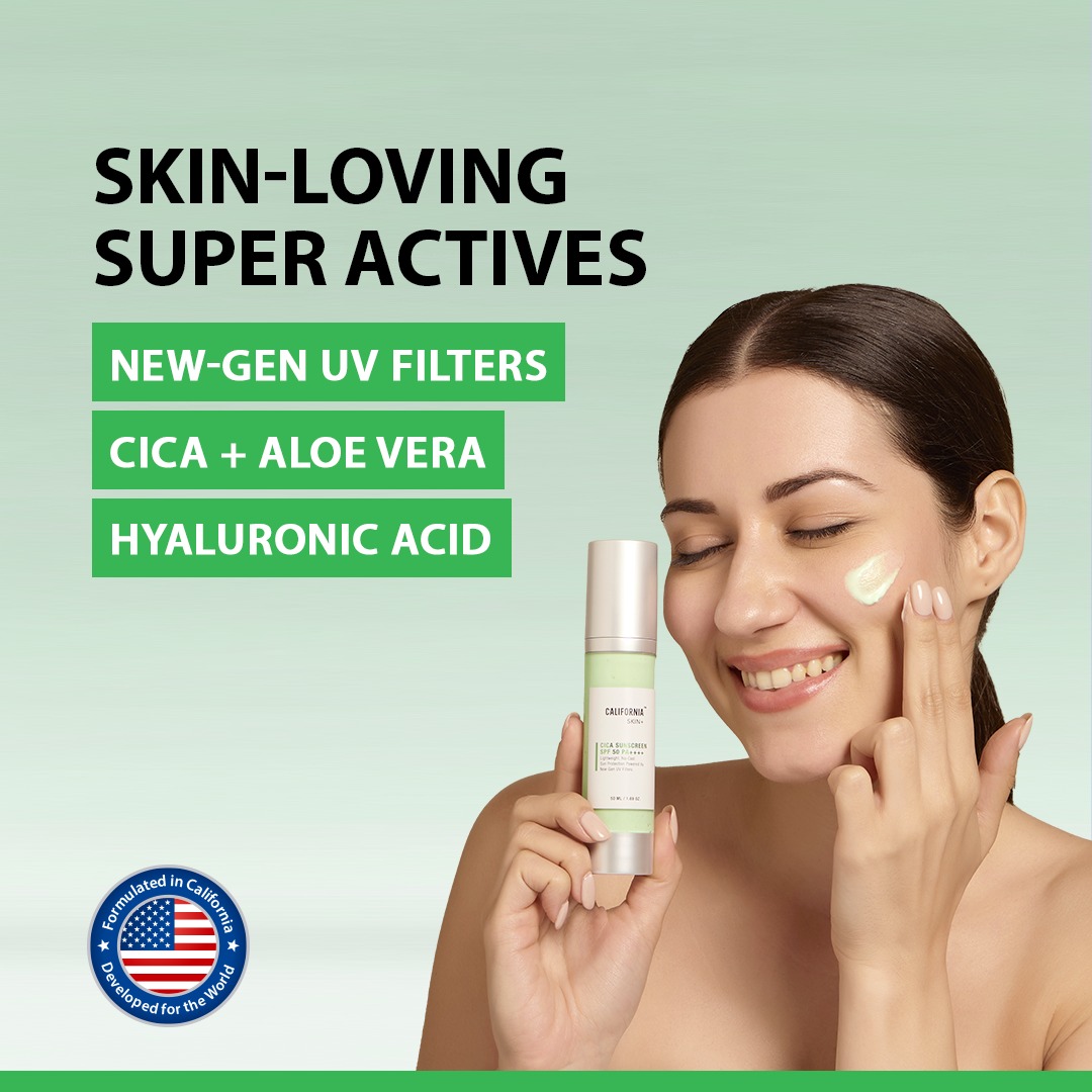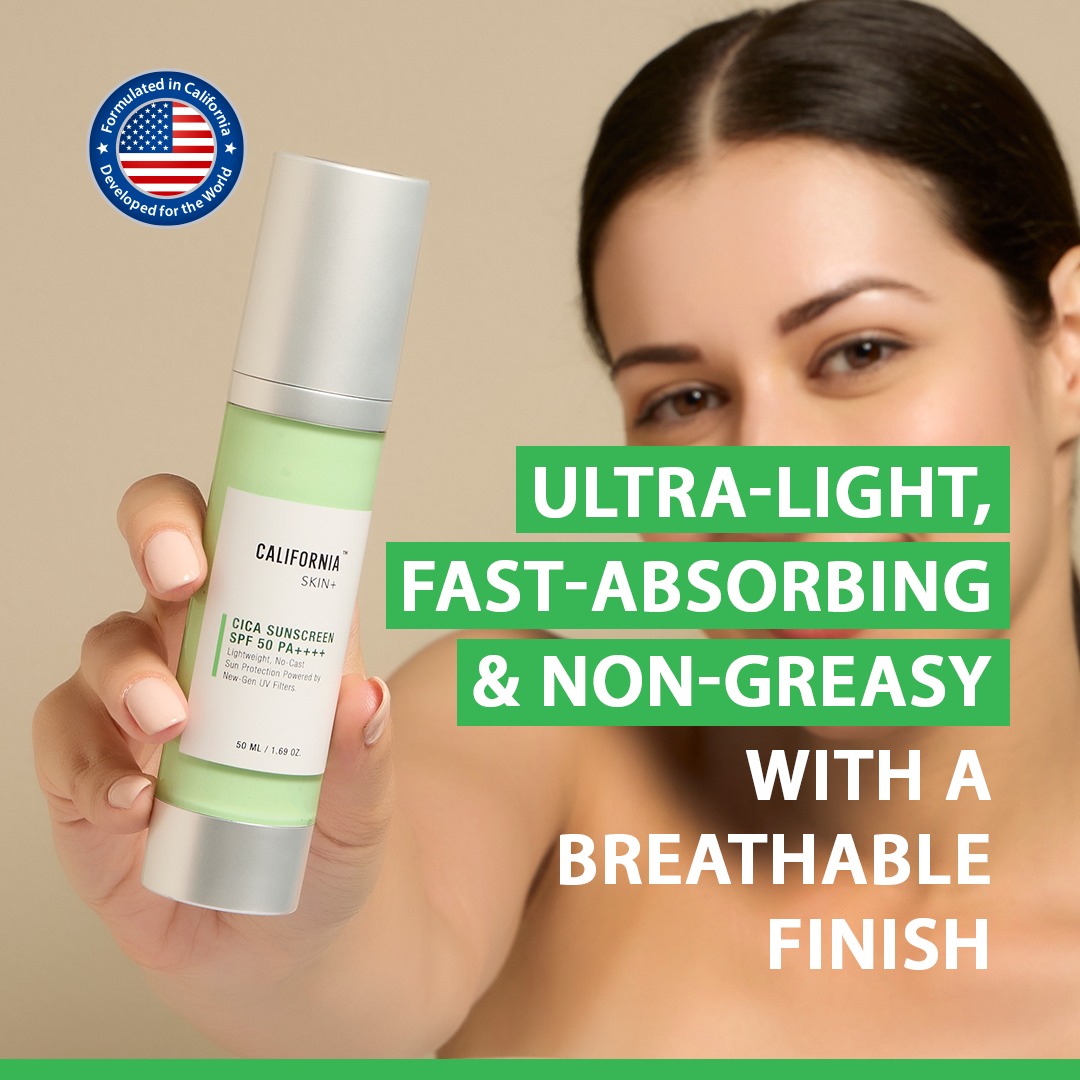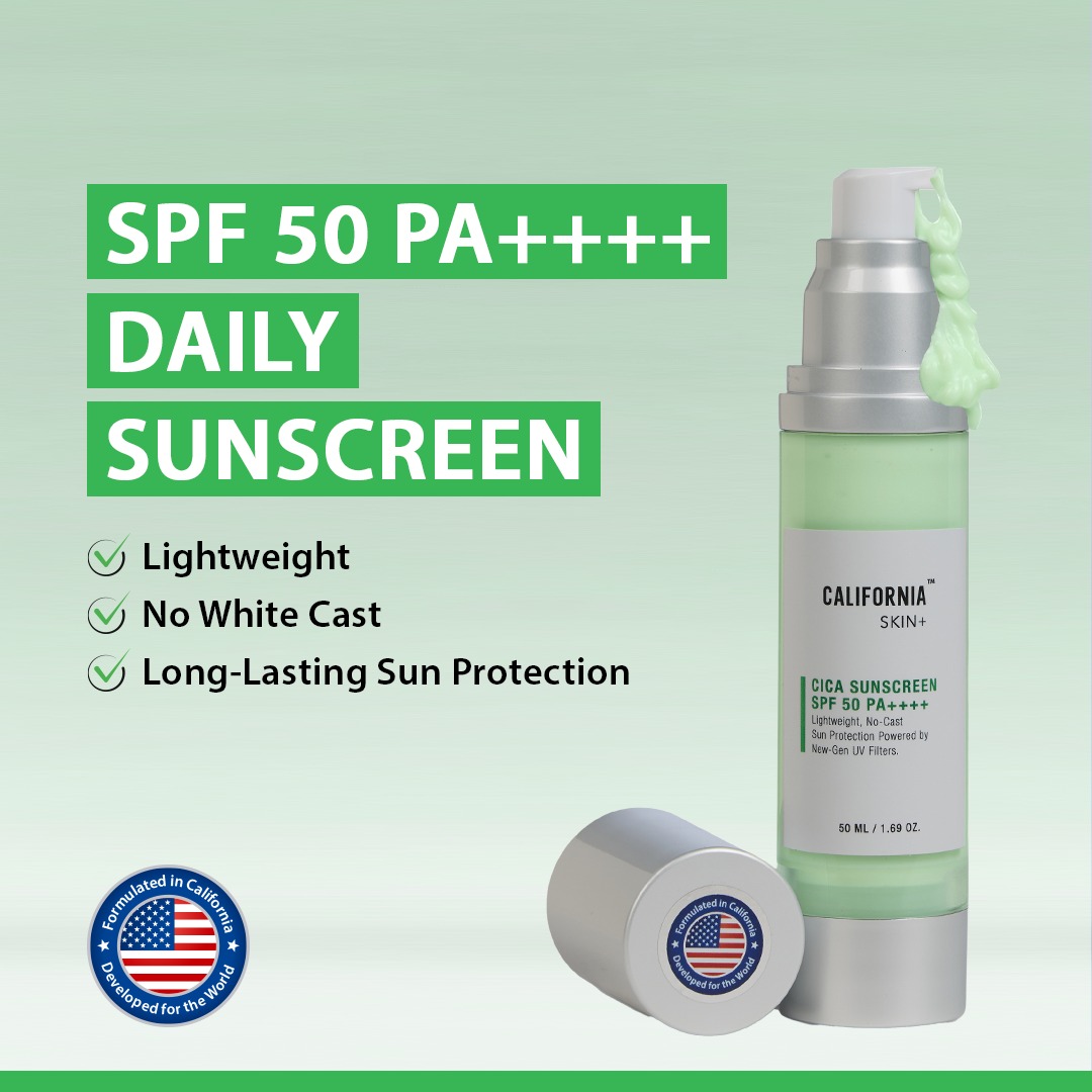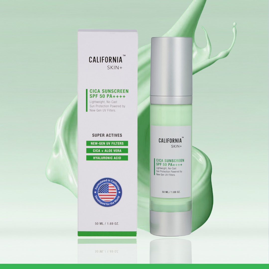 California Skin+ Cica Sunscreen SPF 50 PA++++ is a lightweight daily sunscreen that protects your skin from harmful UVA and UVB rays while keeping it calm, hydrated, and shine-free.